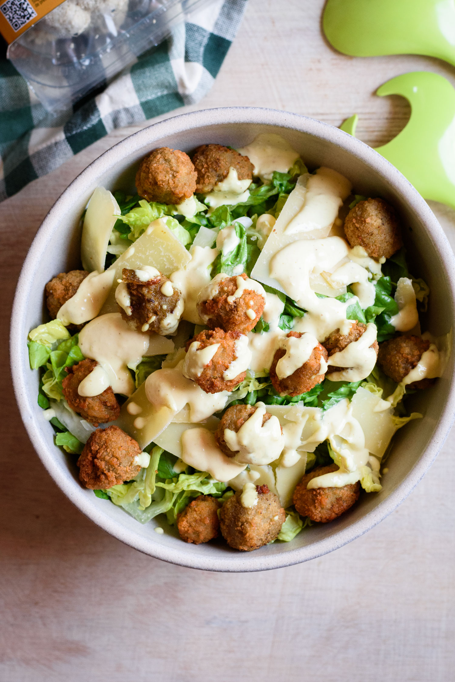 Close up of a sliced Spanish omelette with bread, eggs, and a red checkered napkin on a textured blue concrete surface