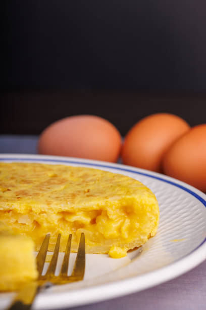 Traditional spanish omelette with ingredients on black slate background